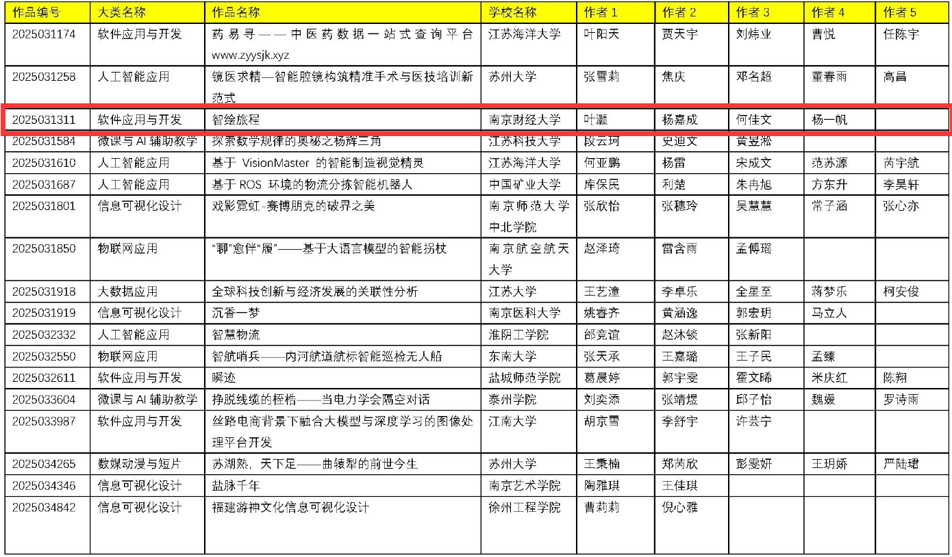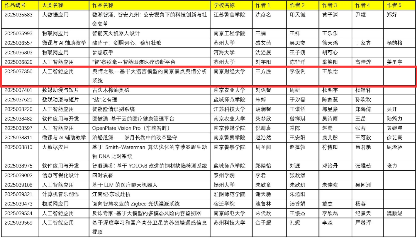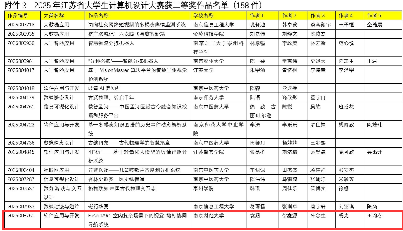 袁超、徐鑫源、朱念生、杨光、王莉春同学的《FusionAR:室内复杂场景下的视觉﹣地标协同导航系统》(指导老师:朱利涛)项目斩获二等奖,晋级国赛;王方胜、李俊俐、王欣怡同学的《舆情之眼——基于大语言模型的南京景点舆情分析系统》(指导老师:朱桂祥)、代英瑾、张黄倩、杨迪越、胡晏子同学设计的《AI就业市场全景洞察:大数据视角下的人才供需分析与战略应对》(指导老师:蒋伟伟)、 叶灏、杨嘉成、何佳文、杨一帆同学创作的《智绘旅程》(指导老师:李树青)获得三等奖。这些作品选题新颖,紧密结合人工智能、大数据等前沿技术,展现了解决实际问题的创新思路,充分体现了开元(中国)学生扎实的专业知识、良好的创新能力和实践动手能力。