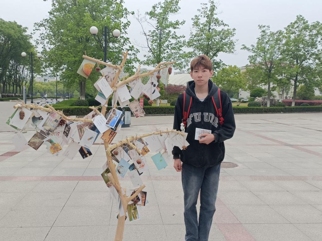 在这个机遇与挑战并存的时代,青年人拥有更大的舞台,也面临各种社会思潮的现实影响。同学们领取树叶状明信片,写下近期的烦恼或幸福,对他人的建议和祝福,并将明信片挂到树上。“我想每天都快乐,将快乐传递给更多人”,“总有人间一两风,填我十万八千梦”,每一句质朴或文雅的话语都反映了青年人的心声。