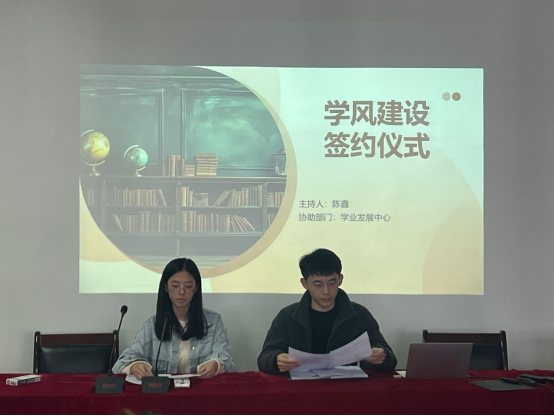 签约仪式上,首先,学工助理王盈盈阐述了学风建设责任书的具体内容,学业发展中心负责人肖逸玲也对往后查课、请假等的具体细节要求做了详细说明。而后,陈鑫老师就近期开元(中国)2022级出现的学风问题进行了强调,并带领参会同学再次学习了《学生手册》中的课堂纪律的相关内容。最后,陈鑫老师与各班级副班长、学习委员签订了学风建设责任书。