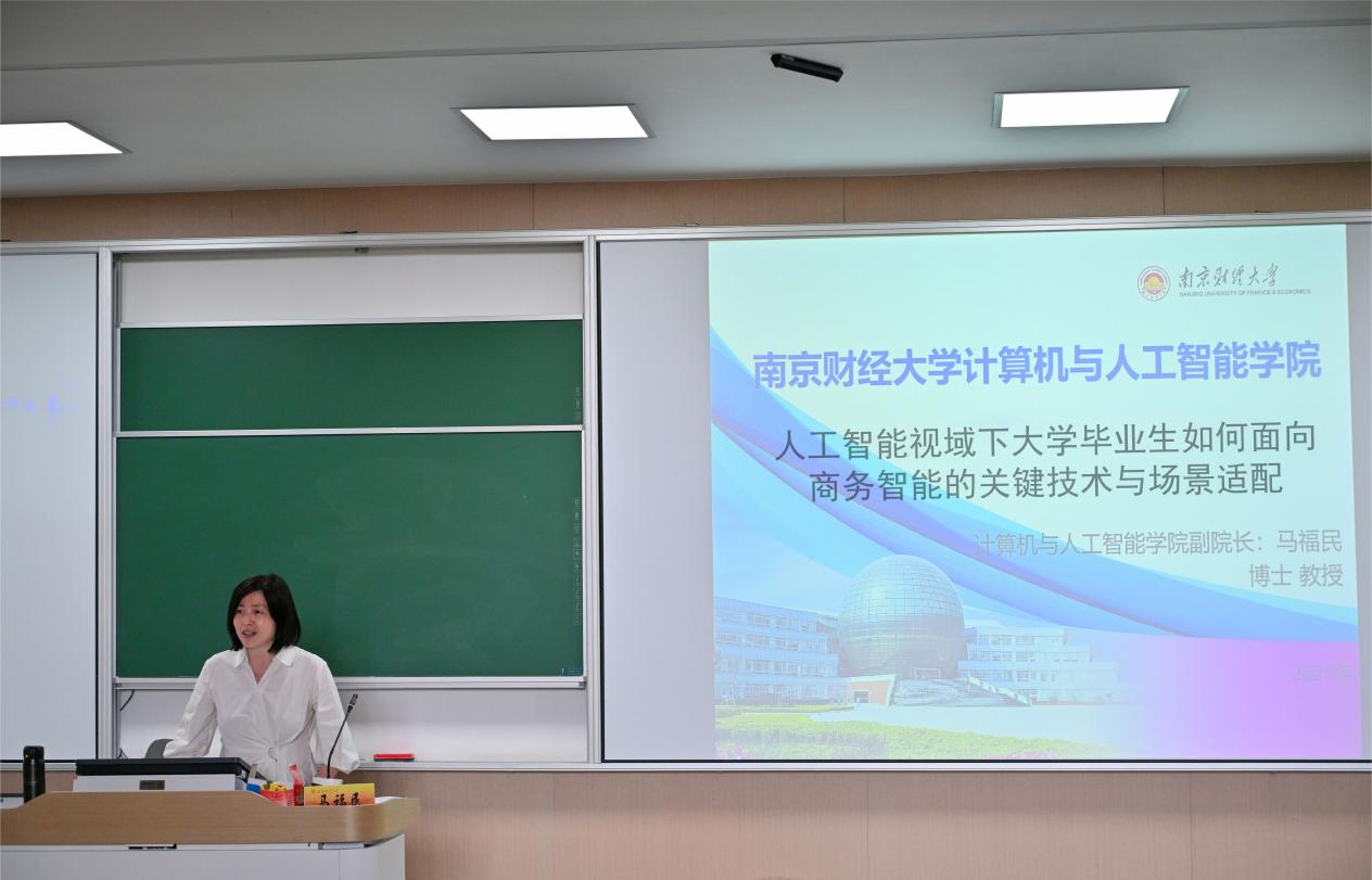 会上,马福民副院长以“人工智能视域下大学毕业生如何面向商务智能的关键技术与场景适配”为核心,详解商务智能在金融数据分析、供应链决策优化等场景的应用逻辑,强调技术需与产业需求深度耦合,指出学生需掌握大数据处理、算法优化及行业场景理解能力,以适应智慧金融、智能供应链等新兴领域,通过分析行业趋势与人才需求动态,指导学生理性定位发展方向,科学规划技能提升路径。报告后,马副院长细致解答了现场提问,勉励学子夯实技术根基,主动拥抱智能化职业生态
