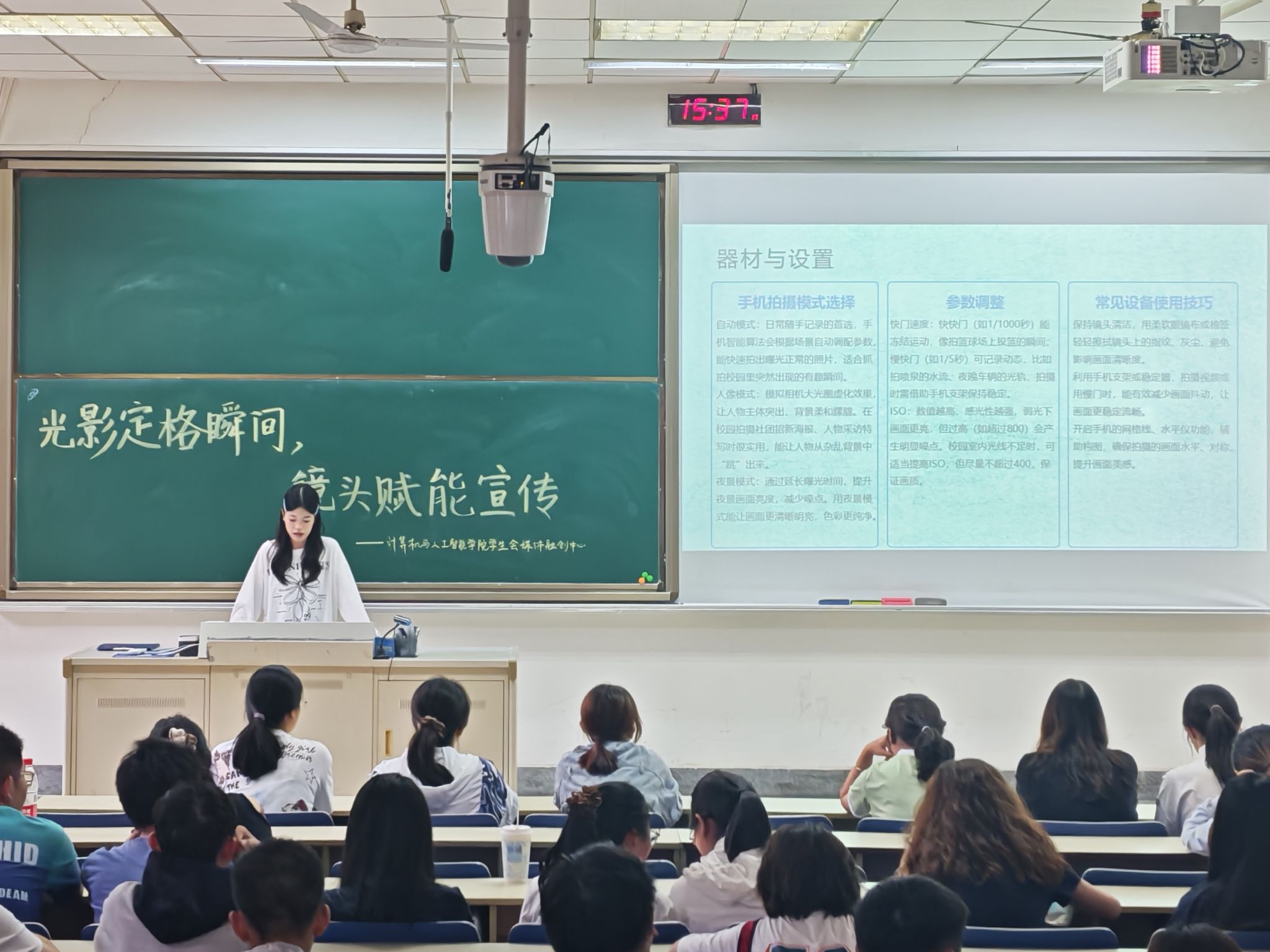 为提升计算机与人工智能学院学生会成员的摄影技能与宣传工作能力,激发大家对摄影艺术的兴趣,进一步推动学院宣传工作的开展,10月12日,学院在德业楼101教室成功举办摄影培训活动。本次活动由学生会媒体融创中心组织,2025级全体学生会成员参加。
