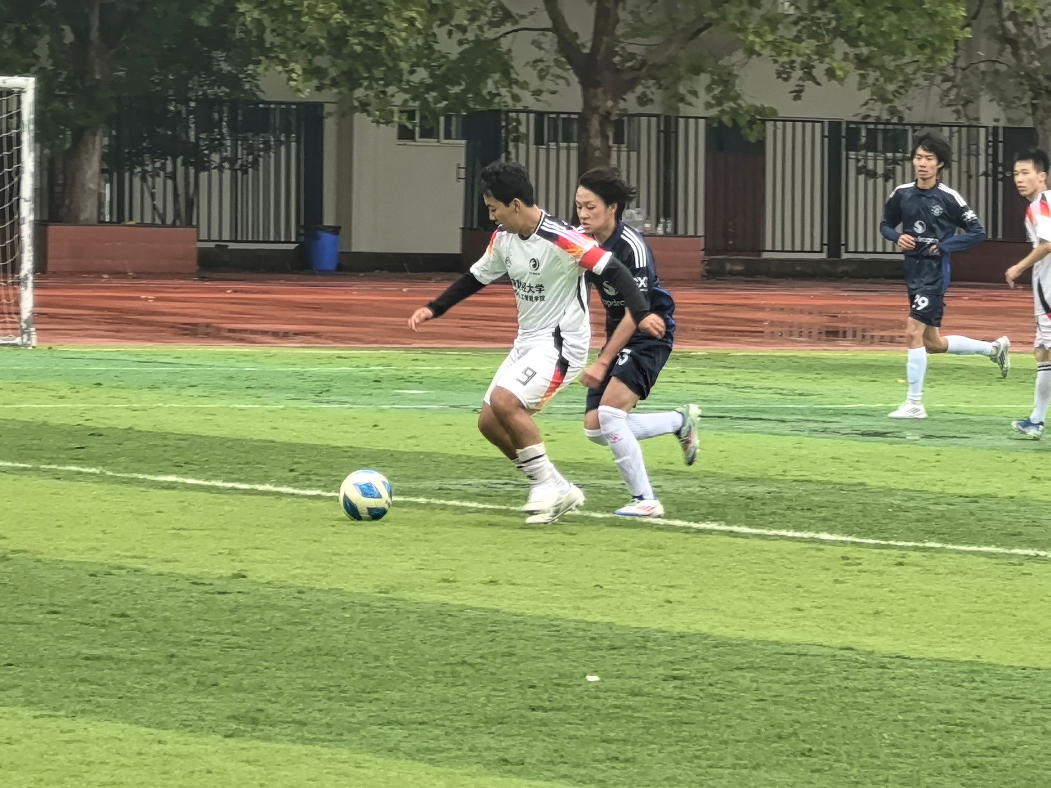 10月12日上午十点,计算机与人工智能学院与会计财税学院的比赛率先打响。一开场,身着白色队服的我方队员便迅速进入状态,展现出强大的中场控制力与流畅的传接配合。他们凭借精准的传导与灵活的穿插跑动,持续向对方防线发起进攻。